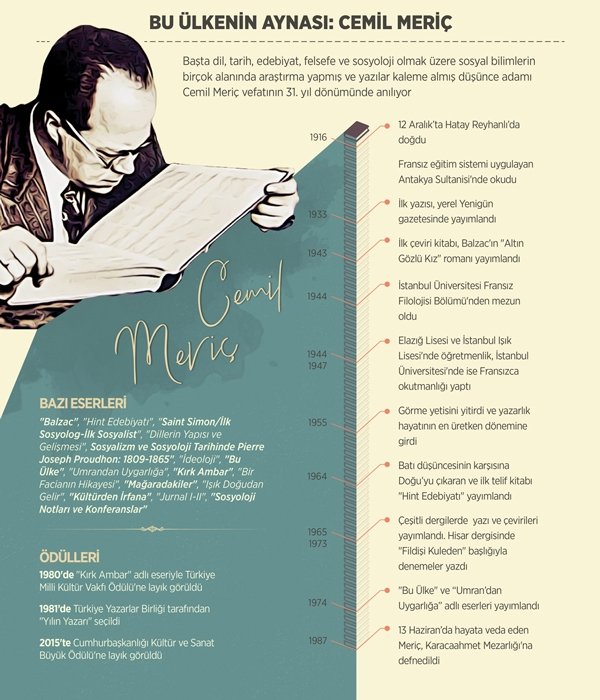 Başta dil, tarih, edebiyat, felsefe ve sosyoloji olmak üzere sosyal bilimlerin birçok alanında araştırma yapmış ve yazılar kaleme almış düşünce adamı Cemil Meriç, vefatının 31. yıl dönümünde anılıyor.