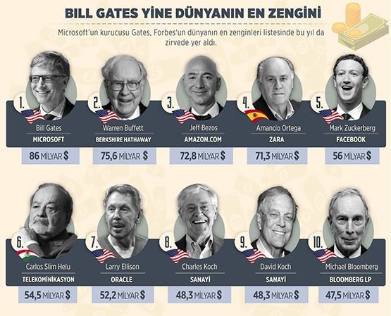 Microsoft'un kurucusu Amerikalı iş adamı Bill Gates, geçen yıl 75 milyar dolar olan kişisel servetini bu yıl 86 milyar dolara çıkararak listede bir kez daha birinci sırada yer aldı. Son dört yıldır zirveyi kimseye kaptırmayan Gates, 1994'ten bu yana bulunduğu listede 18. kez en tepede yer aldı.