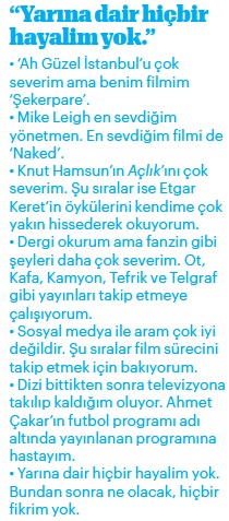 BA: Plan ve program konusunda çok kötüyüm. Şu an hiçbir şey için bir motivasyonum yok. Belki bir daha film çekmeyebilirim, belki senaryo yazmayabilirim, belki de yeni bir diziye başlayabilirim. Bu; hayatın bana neler getireceğiyle ilgili. Çok fazla kitap isteniyordu yayınevlerinden. Belki kitap yazabilirim. Belki de şu an sadece çok yorgun olduğum için böyle konuşuyorumdur.