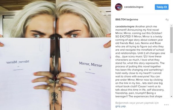 Modellikle başlayan kariyerine oyunculuk ve şarkıcılıkla taçlandıran Cara Delevingne, yetenek yelpazesine şimdi de yazarlığı ekledi. Kalema aldığı aşk romanı 'Mirror Mirror'da (Ayna Ayna) 16 yaşlarında 4 arkadaşın aşk hayatını anlatan Cara Delevingne, kitabı Instagram hesabından duyurdu.