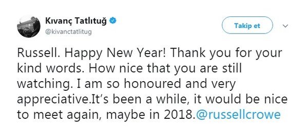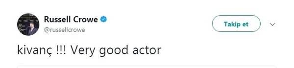 Daha önce 'Son Umut' adlı filmle Türk izleyicisinin karşısına çıkan Crowe, yaklaşık 3 milyon takipçisi olan Twitter hesabından Tatlıtuğ için "Kıvanç, çok iyi aktör" yazdı.