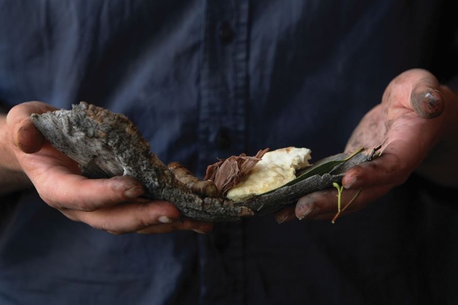 René Redzepi, 2010'da Avustralya'daki Iga Warta yerli topluluğunu ziyareti sırasında kabuktan bir tabakta kanguru eti tutuyor.