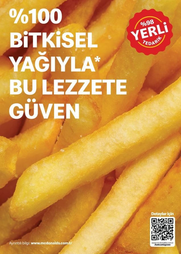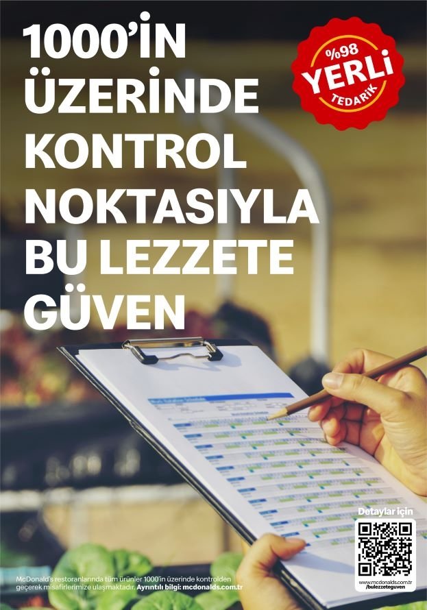 McDonald's Türkiye CMO'su Özdeş Dönen Artak, tüketicilerin yediği yemeğin içeriğini tüm şeffaflığıyla bilme hakkına saygı duyduklarını ve bu kapsamda hem üretim hem tedarik süreçlerini açıklıkla paylaştıklarını belirtti. Artak dergimize yaptığı açıklamada, "Güvenli ve sürdürülebilir gıda odağında başlattığımız 'Bu Lezzete Güven' kampanyasıyla birlikte, Türkiye'nin alanında en iyi firmaları arasından seçerek hazırladığımız ürünlerimizin her aşamasını tüketicilerimize gönül rahatlığıyla aktarıyoruz. Bu kapsamda tedarik ettiğimiz ürünleri 1000'den fazla kontrol noktasından geçirdikten sonra misafirlerimize sunuyoruz" dedi.