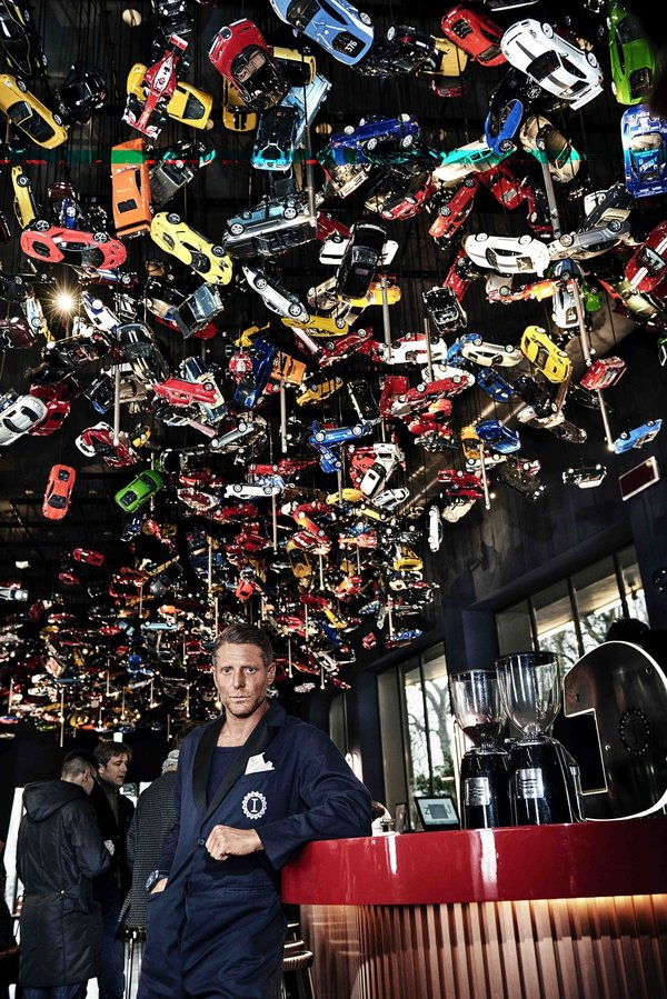 Elkann, Garage Italia için Gentucca Bini tarafından tasarlanan tulumla tavanından binden fazla Bburago model minyatür otomobilin sarktığı barda ayakta dururken.