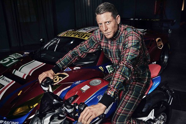 Elkann Garage Italia Ferrari Yarış Takımı'nın giydiği ekose tulumla bir MV Agusta motorun üzerinde otururken.