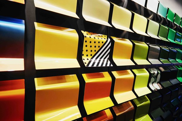 Burada gördüğünüz Garage Italia'nın 'Materioteca' salonunun duvarları. Bu duvarlar ziyaretçilerin hayal gücünü doyurabilecek şekilde birçok farklı metalin boyanıp bir araya gelmesi sonucu ortaya çıkmış.