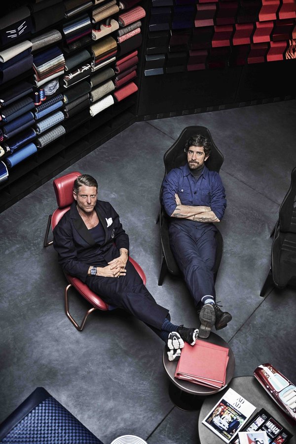Elkann ve Garage Italia'nın kreatif birimlerinin yöneticisi Carlo Borromeo özel yapım Cassina koltuklarda oturuyor. Elkann'ın kolundaki saatin markası Hublot.