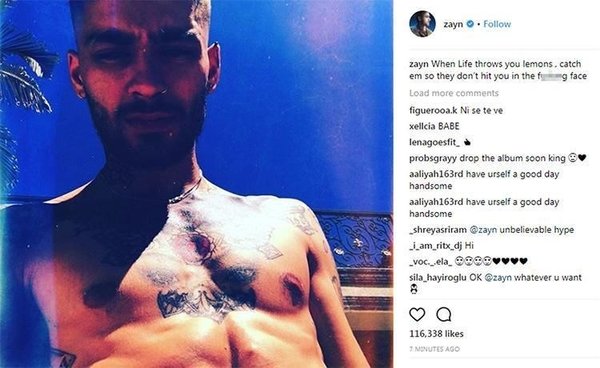 Malik, Instagram hesabından üstsüz bir fotoğrafını, daha önce Gigi Hadid'in gözlerini dövme olarak yaptırdığı göğsünü net gösterecek şekilde, paylaşarak; "Hayat size limon atmaya başladığında onları yakalayın ki lanet olası yüzünüz yaralanmasın." notunu düştü. Şarkıcının gönderisi, hayranları tarafından Hadid'e ayrılık sonrası bir gönderme olarak yorumlandı.