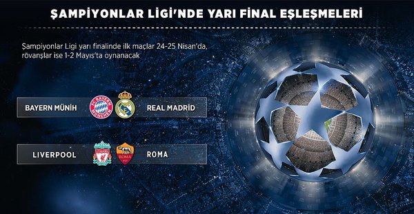 Yarı finalin diğer müsabakasında ise İngiltere temsilcisi Liverpool ile milli futbolcu Cengiz Ünder'in forma giydiği İtalya ekibi Roma karşılaşacak. İlk karşılaşma, İngiltere'de gerçekleştirilecek.