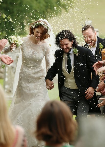 İzlenme rekorları kıran Game of Thrones (Taht Oyunları) dizisinin iki yıldısı Rose Leslie ile Kit Harrington'ın sette başlayan aşkları evlilikle taçlandı. İki oyuncu, geçtiğimiz hafta sonu İskoçya'da bir şatoda düzenlenen törenle hayatlarını birleştirdi. Leslie ve Harrington'ın düğününe dizideki rol arkadaşları da katıldı.