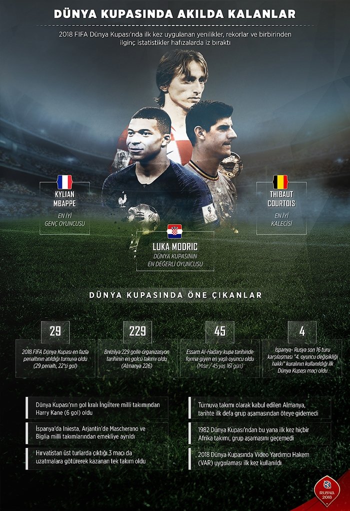 Rusya'nın ev sahipliğinde Fransa'nın zaferiyle sona eren 2018 FIFA Dünya Kupası, erken turlarda birçok favori adayın elenmesinin yanı sıra birçok farklı istatistiği ve ilkleriyle de öne çıktı.