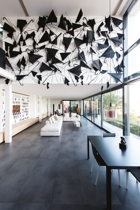 Mimarisi Han Tümertekin imzalı olan Arnavutköy'deki B3 Evi'nde yer alan eserlerden, şemsiyelerden oluşan yerleştirme Şakir Gökçebağ'a