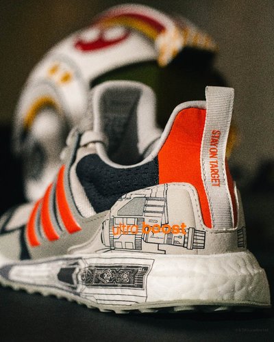 X-Wing Starfighter'den esinlenen Ultraboost S&L ayakkabıları, geminin gri ve turuncu topçularını ve dış kabuğunu hatırlatan bir renk paleti ile gösteriyor. Karanlıkta parlayan unsurları, yarı parlak olarak üretilen ağı ve metalize şeritler loş ortamlarda göze çarpıyor. Deri bir kafesle örülü Boost tabanının üstüne oturtulan ayakkabıda topuğun dokuma yüzeyi "STAY ON TARGET", "THE FORCE WILL BE WITH YOU, ALWAYS" gibi ikonik alıntılarla tamamlanıyor.
