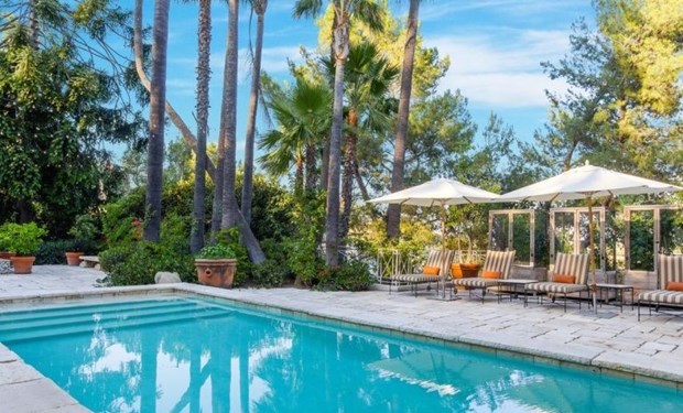 Kaliforniya güneşinden fazlasıyla yararlanan malikânenin dev bir yüzme havuzu ve bahçesinde meyve ağaçları bulunuyor.