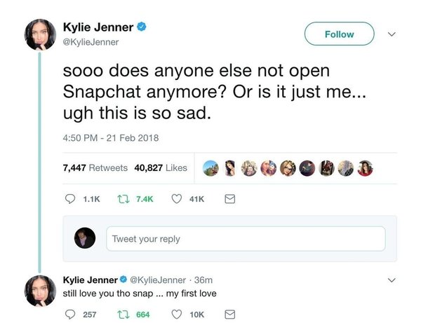 Daha sonra ise söylemini yumuşatmak için "Seni hala seviyorum Snap... benim ilk aşkım" yazılı yeni bir tweet attı, ama Snapchat'in düşüşünü engelleyemedi.