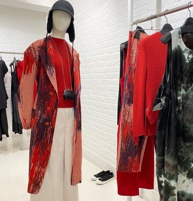 Baş döndürücü iç tasarım; sezonlarında gömlek ve dış giyim üzerinde görmeye alıştığımız metin baskısıyla döşemeyle Yamamoto'dan da ipuçlarını alıyor.