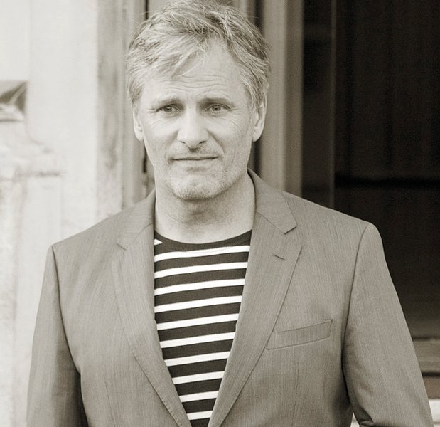 Oyuncu Viggo Mortensen çizgili tişörtü klasik bir takım ceketinin altına giymeyi tercih ediyor.