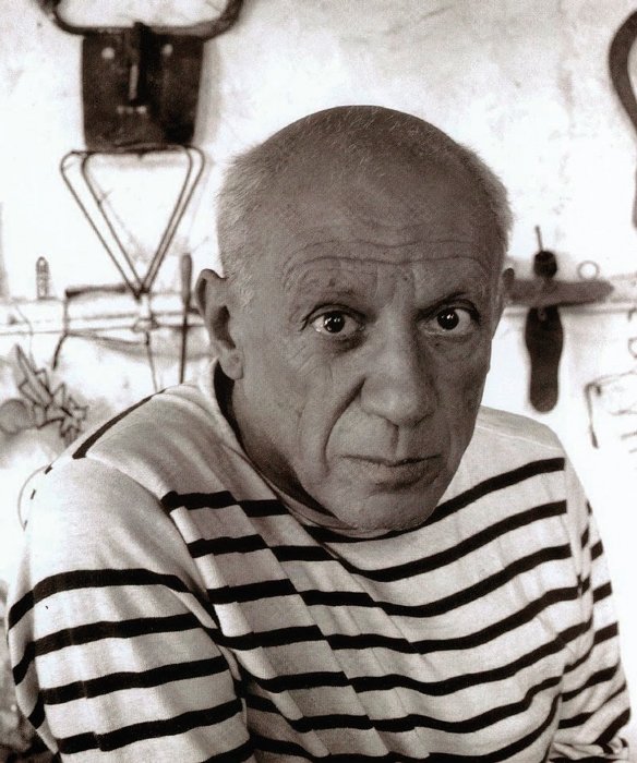 Pablo Picasso, 1962'de Fransa-Vallaruis'de çekildiği karede üzerinden pek çıkarmadığı çizgili tişörtüyle görülüyor.