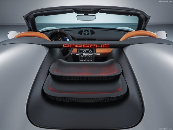 1988 model 911 Speedster'dan bu yana gelenekselleşmiş bir tasarım çizgisi olan 'çift bombe' tasarımına sahip ve karbon fiberden yapılmış özel arka kapak, devrilme koruma yapısını kaplıyor ve ön koltukların arkasında birleşiyor. Bombelerin arasında yer alan kontrast siyah renkteki hava kanatçıkları otomobile aerodinamik bir dokunuş katarken şeffaf Plexiglas rüzgâr önleyiciye işlenmiş 'Porsche 70 yaşında' logosu, markanın geçmişini ön plana çıkarıyor.