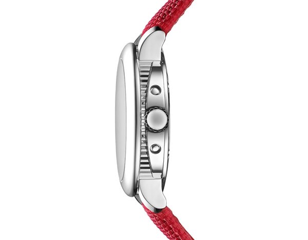 Kadranı süsleyen dakika imleri, kırmızı tonuyla hem Mickey Mouse'un şortunun rengini yakalıyor hem dokulu kauçuk kayışla uyum sağlıyor. Her zamanki gibi, Mickey Mouse'un hareketli kolu akrep işlevi görerek dakikaları sayıyor.