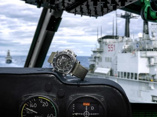Radar tarzı küçük saniye kadranı ve üzerine kazınmış Aviazione Navale amblemi gibi detaylar, askeri havacılıkla olan bağlantıyı vurguluyor.