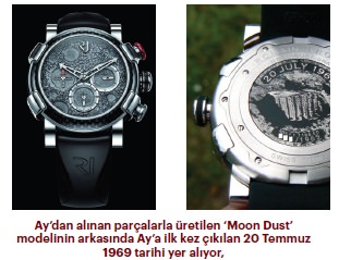 Örneğin; Moon Dust, 'uzayın fethinden' ilham alınarak tasarlanmıştı. Çelik, gümüş ve altın versiyonları olan saatin kadranı, Ay yüzeyinin bir tasviriydi ve Ay tozlarından oluşturulmuştu. Saatin metal aksamları Apollo 11'den, kayışı Uluslararası Uzay İstasyonu'nda giyilen dokuma ve karbon fi ber içeren timsah derisi giysilerden elde edilmişti. Saat ve dakika, uzay aracının güneş panellerinden, küçük saniyeler Ay'ın iniş hedefi nden ilham alıyordu ve saat, Ay'a çıkılan tarihe gönderme yapmak için 1.969 adet üretilmişti. Yvan Arpa, kendi markasını kurup Romain Jerome'dan ayrıldıktan sonra yerine gelen Manuel Emch, Ay tozu parçalarının Teksas'taki Uzay Kâşifl eri Derneği tarafından tedarik edildiğini ve her bir saatin, orijinalliğini kanıtlamak için özgünlük belgesiyle sunulduğunu anlatıyor. Materyali elde etseler de, özgünlüğünü kanıtlayamadıkları bir ürün sunmayacaklarını da ekliyor. Dinozor fosillerini de bir müzayededen elde etmişler.