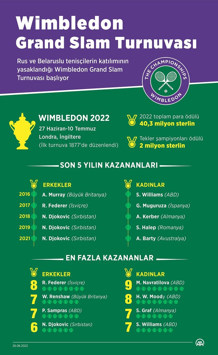 Erkekler dünya sıralamasının zirvesindeki Daniil Medvedev'in de aralarında bulunduğu Rus ve Belaruslu tenisçilerin katılımının yasaklandığı Wimbledon Grand Slam Turnuvası yarın başlayacak.