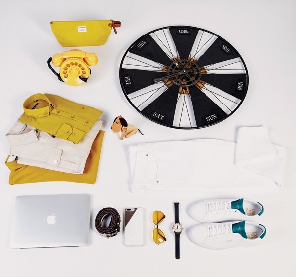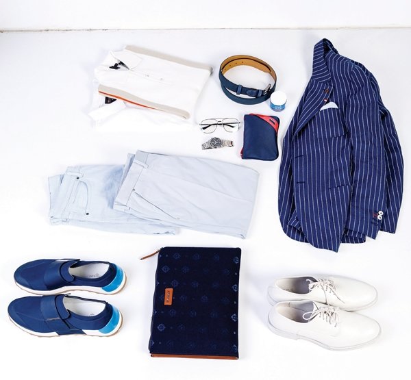 UÇUK TONLAR; gömlek MUDO 99,95 TL, polo yaka tişört (çizgili) SCOTCH & SODA (Beymen) 465 TL, süet ayakkabı H&M 99.99 TL, pantolon (solda) TED BAKER 565 TL, tişört BRAND WHO 210 TL, ajanda LOUIS VUITTON 2.690 TL, kol saati OMEGA (Fiyat istek üzerine.), kitap V2K 54 TL, pantolon V2K 345 TL, kravat BROOKS BROTHERS 566 TL, optik gözlük VINTAGE (Moda editörüne ait.)