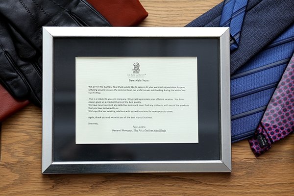 Dress Best Uniforms, K.K.T.C Havayolları'nın üniforması için ünlü moda tasarımcısı Hüseyin Çağlayan'la işbirliği yapmış. Fotoğrafta bu işbirliğine ait bir kart görülüyor. (sağ sayfada) Ritz Carlton'ın Abu Dabi şubesinin teşekkür amacıyla gönderdiği belge.​