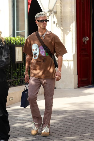 Dior Erkek koleksiyonundan kahverengi "oversized" Cactus Jack Dior tişörtü, paçaları fermuarlı açık mor renkte binici pantolonu, kahverengi deri Saddle çantası ve bej B713 sneaker'ları ile Romeo Beckham.