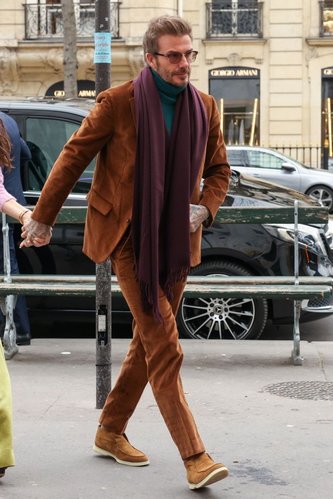 David Beckham bu zihniyete sahip görünüyor. Geçen hafta Paris'te, son zamanlarda gördüğümüz tüm siyah terziliğin antitezi olan bir takımla otelinden çıkarken görüntülendi. 6 derecelik havada (en hafif tabirle havalı) 47 yaşındaki adam, deniz mavisi bir balıkçı yaka, erik rengi bir atkı ve tarçın rengi ayakkabılar eşleştirilmiş yanık turuncu takımdan oluşan eksiksiz bir Loro Piana görünümü giydi; Kendal Roy onaylı markayı düzenli olarak benimseyen yıldızlarla dolu ekibe dahil oldu. Eski futbolcunun meşhur gardırobu, kasvetli olmayan giysilerle dolu bir sezonun başlangıcını işaret ediyor.
