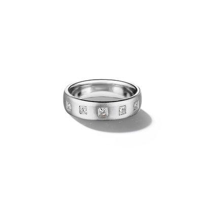 Mimi So, lüksü yaşamla birleştirmeyi amaçlıyor; bu nedenle markanın nişan yüzüğünün de ölüm sizi ayırana kadar sizinle kalması mantıklı. Platin bir bant üzerine yerleştirilmiş bu, ne çok gösterişli ne de sıkıcı olan yüzük, beş adet prenses kesim pırlanta ile süslenmiş.