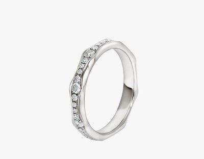 Bir nişan yüzüğü, parmağınızda hafif olmalı ve zahmetsiz hissettirmelidir: Bulgari bunu çok iyi biliyor. Bu ince alyans da, gelgitlerden ve dalgaların hareketinden ilham alarak pavé pırlantalarla süslenmiş. Kıvrımlı kenarlar sonsuzluğu temsil ediyor ve kim aşkının sonsuza dek sürmesini istemez ki?