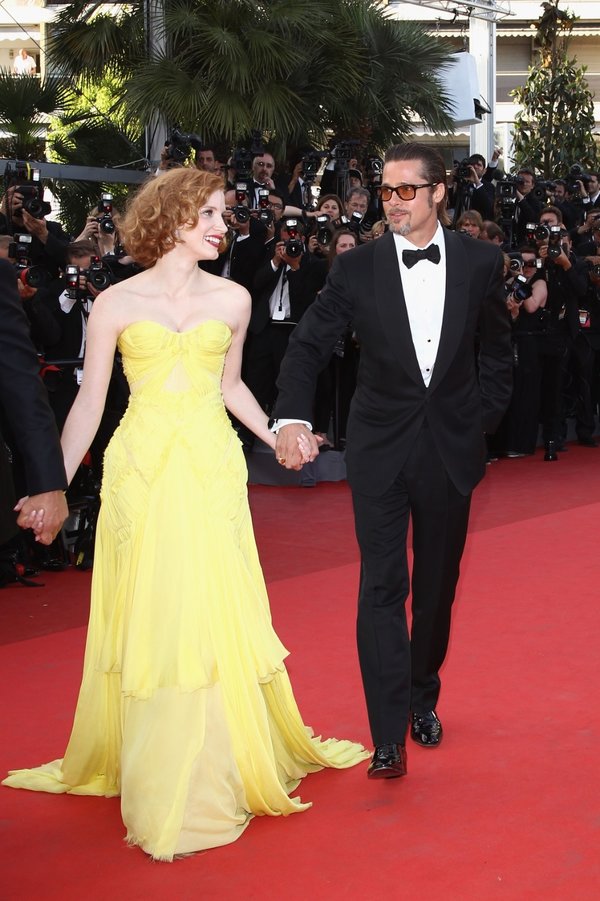 Kırmızı halıda smokin görmek olağan, peki bunu arkaya taranmış saçlar ve turuncu güneş gözlükleri ile bir araya getireni görmüş müydünüz? Pitt, doğru aksesuarlarla geleneksel terziliğin modern görünebileceğini kanıtlıyor.