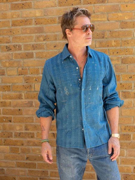 Pitt'in sonraki sahnelerde giydiği Indigo gömlek de girişteki parçalarla kombinlenmiş. Bu dikkat çekici tasarım, Hindistan merkezli 11.11 / eleven eleven markasına ait. Julian Day, bu gömleği özellikle karakterin görsel dünyasına uyumu ve dokusuyla tercih ettiğini söylüyor. Doğal boyalarla elde edilen yumuşak indigo tonu, Hayes'in zamansız ama kişisel stiline tam oturuyor. Üstelik bu tercih yalnızca estetik değil, günümüz moda anlayışına da göz kırpan bir bilinç barındırıyor: El işçiliği, yerel üretim ve sürdürülebilirlik.