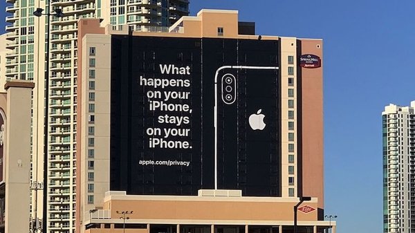Her yıl olduğu gibi CES 2019'a katılmayan Apple, Las Vegas'taki fuar alanının karşısındaki bir binaya reklam verdi. Apple, "Vegas'ta olan Vegas'ta kalır" sloganı üzerinden "iPhone'unuzda olan her şey, iPhone'unuzda kalır" diyerek, Google'ın Android sistemindeki güvenlik tartışmalarına gönderme yaptı.