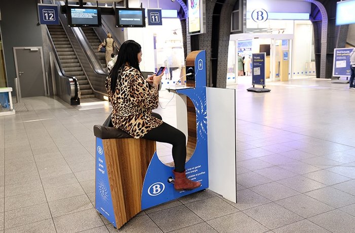 Brüksel'deki Güney Tren İstasyonu'nda bulunan 4 adet sabit bisikletle pedal çevirerek elektrik üretilebiliyor.
