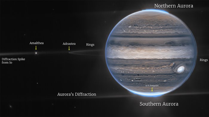 BBC'nin haberine göre, James Webb'in temmuzda elde ettiği görüntülerde, Jüpiter'i çevreleyen auroralar, dev fırtınalar, uydular ve halkalar ayrıntılı görünüyor.