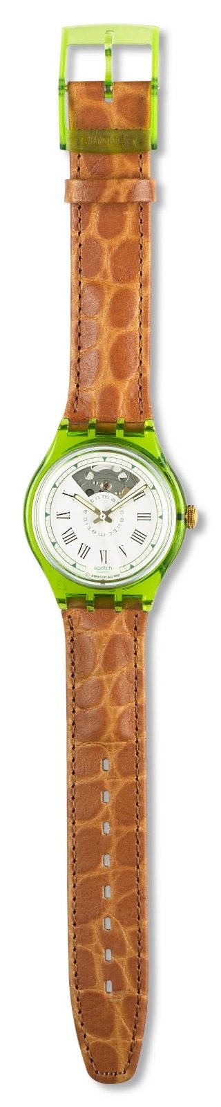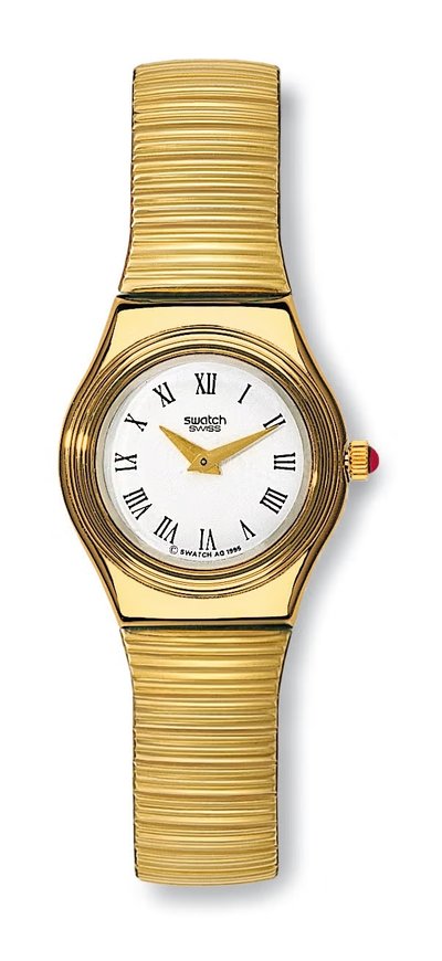 Altın rengi paslanmaz çelik kasası ve Roma rakamlı beyaz kadranıyla dikkat çekiyor. Benim saatim çok sofistike, yeşil timsah derisi kayışlı [yukarıda altın bilezikli versiyonu gösterilmiştir]. Swatch saatlerinde kayışlar, genellikle kadran kadar önemlidir.
